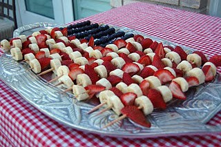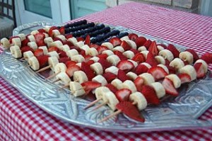 Wash strawberries and blueberries. Chop strawberries into large chunks. Peel and cut the bananas into large chunks. Slide pieces of fruit onto skewers leaving space on the ends of the skewers for handling. Serving Option: Spread yogurt onto a wide plate and roll kabobs in the yogurt until lightly coated, then sprinkle kabobs with shredded coconut.