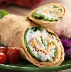 Combine first 9 ingredients and stir well. Line a tortilla with a lettuce leaf and spread about 2/3 cup of chicken mixture on top of the lettuce. Roll the tortilla into a wrap and slice in half.