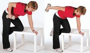 Choose a dumbbell that you can lift 10-15 times in your left hand. Stand in a split-stance position with your right leg forward. Keep your weight evenly distributed through the heels of both feet. Tighten your abdominal and core muscles to stabilize the spine. Place your right hand on your right thigh or on a bench. Slowly lean forward, shifting most of your upper extremity body weight into the right side. Pull your shoulder blades down and back. Your head should be aligned with your spine. Maintain these positions throughout the exercise: