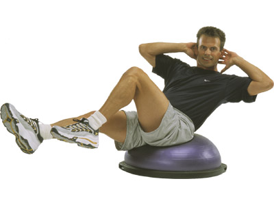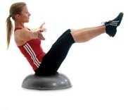 - V-sit: Sit on the dome of the BOSU with hips slightly forward. Lift your legs into a V and lean your torso back with your abs contracted. Hold for a count of 30-60.