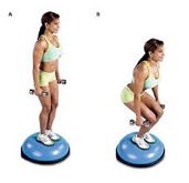 - Dumbbell Squat: While standing on the dome side of the BOSU, with a pair of dumbbells in hand at your sides, lower yourself into a squat and push back up. Do 10 reps.