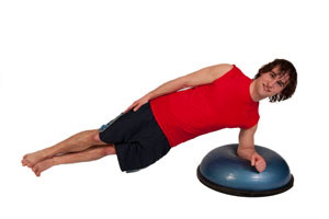 - Forearm Side Plank: With the dome side up, rest your forearm on the BOSU dome and lift your body off the floor, keeping it in a straight line. Contract your abs and squeeze your glute muscles. Hold for 30 seconds then switch to the other arm.