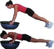 - BOSU Pushup: With BOSU flat side up, get down in the push-up position with hands spaced about shoulder length apart and your feet on the floor. Slowly lower your chest toward the BOSU the press up. Do 15 reps.