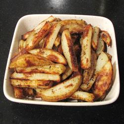 Many restaurants double fry spuds to make them extra crispy. Get the same result by boiling the sliced potatoes for 2-3 minutes (to release moisture), then draining, tossing with olive oil, and baking.