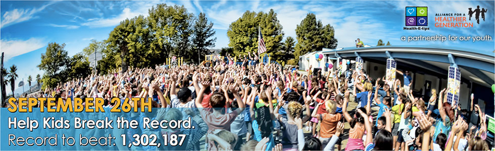 Health-E-tips’ JAM School Program and the Alliance for a Healthier Generation have teamed up for the second annual JAM (Just-A-Minute) World Record. On Thursday, September 26th at 10:00 a.m. millions of kids and adults will be participating to set a new record for the most people taking a one-minute fitness break. JAM World Record was created to promote the importance of everyone being active every day and encourage millions of kids and adults to take “just-a-minute” to get up and get moving.
